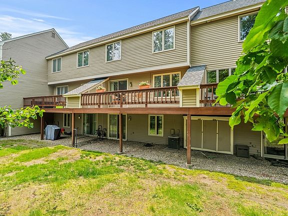 Priced to sell at desirable Brickett Hill! This well maintained Bradford style townhouse offers 2BRs, 2 1/2 Baths, bright Family Room w/ vaulted ceilings, sky lights, hardwood floors, and fireplace. LR/DR opens to large, private deck overlooking wooded conservation land. 2 spacious BRs, 2 full baths, and laundry area on the second level. Full walk-up attic for storage or future expansion. Large, partially finished bonus room w/ walkout to backyard on lower level is ready for your finishing touches. Fresh paint, newer appliances & HVAC system, & garage. Community offers pool, tennis/pickle ball courts, clubhouse, & security gate. Close to tax free NH shopping & highways. Showings begin at Open House on Sunday, June 22 (1:00-3:00).
