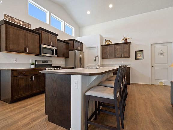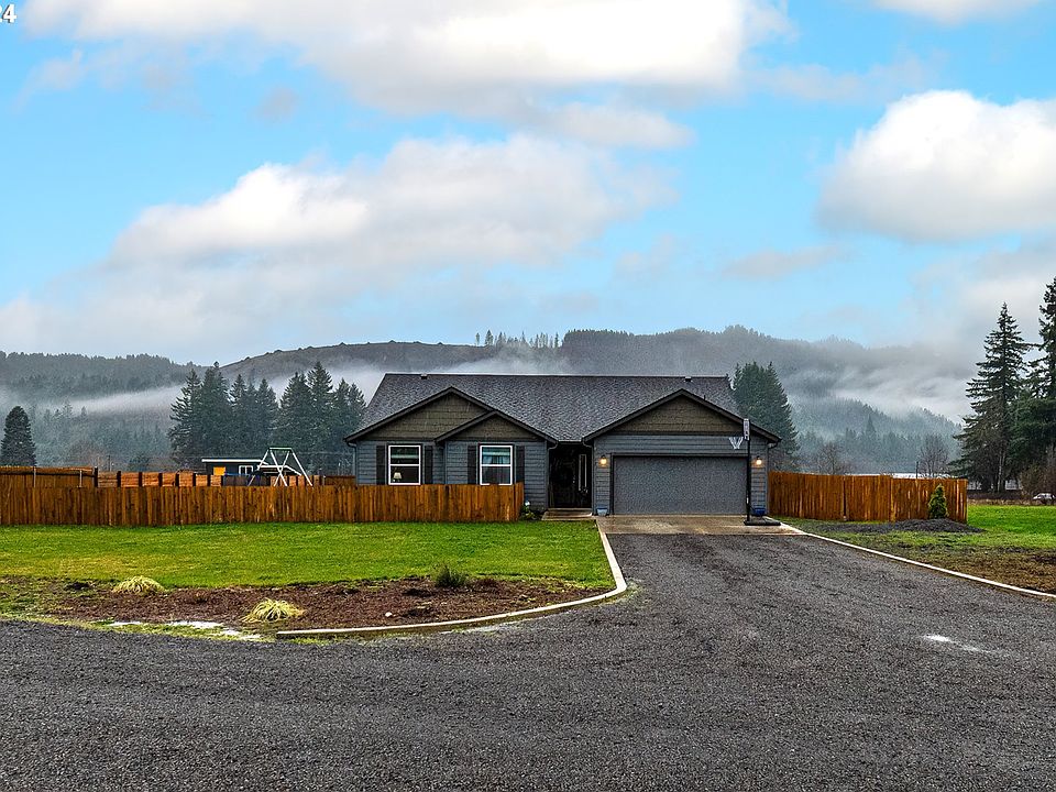 Welcome to your ideal home! This gorgeous 2022 Rancher boasts three bedrooms, 2 bathroom with a generous 1805 square feet of single-level living space. As you enter, you'll be greeted by cathedral ceilings and an open concept design, creating a spacious and inviting atmosphere. Abundant natural light floods every corner through large windows. The heart of the home is a beautiful kitchen with a gas range, soft close drawers, stainless steel appliances, a kitchen island, walk-in pantry, and waterproof laminate flooring. Well-appointed bedrooms offer ample space, whether for family, guests, or a dedicated home office in the den with French doors. The primary suite is a true retreat, featuring a luxurious en-suite bathroom and a walk-in closet. The fully fenced backyard includes a covered patio, perfect for year-round entertaining or enjoying views of the mountains and trees. Located just minutes from the Columbia River Gorge for outdoor activities and within an hour to Portland and Vancouver. This home combines comfort and convenience seamlessly.