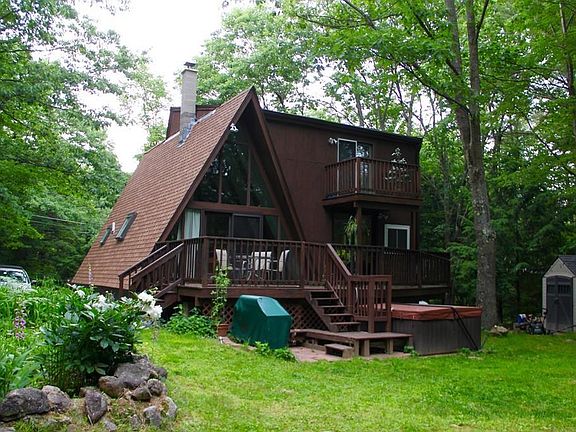 Hubbardston retreat! Contemporary "A-frame" style home, newly painted inside and out. Two bedrooms, 1 bath. New roof - 2017! Sliding doors lead from living room to rear deck & hot tub. Master bedroom with balcony. Additional finished space in basement. Propane heat & wood stove; chimney lined in 2018. 200 amp electric; electric water heater. Some replacement windows and doors. Private well with reverse osmosis system; passed Title 5. Membership in Pinecrest Property Owners' Association ($170 per YEAR) provides full access to private Cushman Pond, with sand beach and boating & fishing access, playground and groomed hiking trails. Close to Route 2, Wachusett Mountain skiing & hiking.
