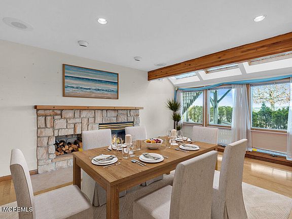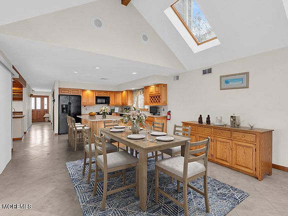 Exceptional waterfront property offering unparalleled living w/ stunning views. Contemporary-style home featuring open floor plan characterized by vaulted ceilings + numerous skylights allowing natural light. Living room boasts wood fireplace, ideal for cozy nights + includes a built-in bar for entertaining guests. Large eat-in kitchen features generous center island + seamlessly opens to dining room, creating a perfect flow for gatherings. 1st floor includes guest bedroom conveniently located next to full bath. 2nd floor, primary bedroom impresses w/vaulted ceiling, spacious closet + access to upper deck. Outdoor living enhanced w/2-story Trex deck for a serene waterfront setting. This home is a true gem for those seeking a luxurious waterfront lifestyle