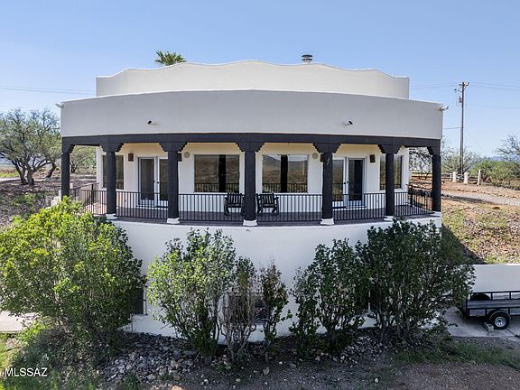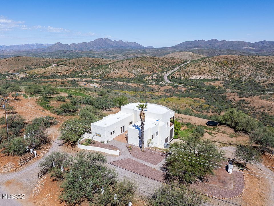 Experience the charm and serenity of desert living in this stunning Santa Fe-style home, nestled on a spacious 4.8-acre lot. Boasting 2,571 sq ft of beautifully designed living space, this 3-bedroom, 2.5 bathroom residence offers a perfect blend of southwestern character and modern comfort. Step inside to a bright, open-concept layout with a split floor plan, ideal for both entertaining and privacy. The gourmet kitchen features granite countertops, stainless steel appliances, a large sland, and a prep sink area perfect for any home chef. The inviting living room is filled with natural light from expansive windows and anchored by a cozy wood-burning fireplace.The primary suite is a true retreat, complete with a walk-in closet, jetted soaking tub, walk-in shower, and dual vanities. All bedrooms are generously sized, offering comfort and flexibility for family or guests.Enjoy breathtaking mountain views and unforgettable sunsets from the wraparound covered patio, designed for outdoor living and relaxation.The lower level of the home includes a spacious garage with private office, storage, RV parking, and a mechanical pit, making it perfect for car enthusiasts or hobbyists. Additional features include a private water well, ensuring self-sufficiency and peace of mind. This home is located in a peaceful, private setting, and just a 6-minute drive to Patagonia Lake, offering quick access to boating, fishing, and hiking. Come take a look!