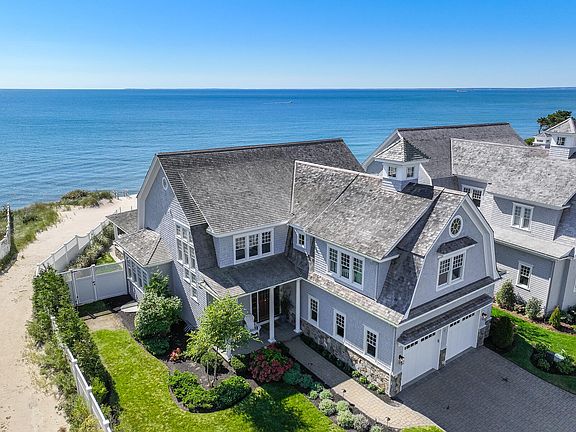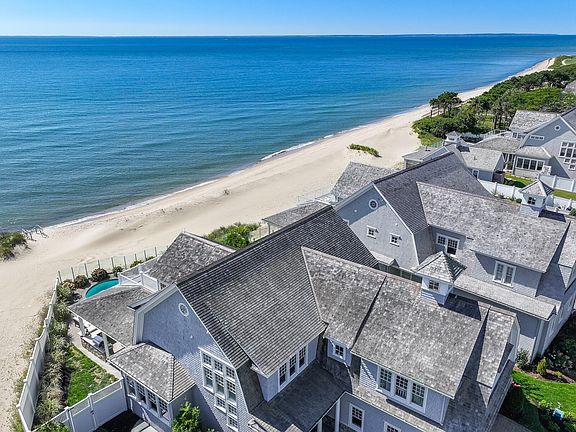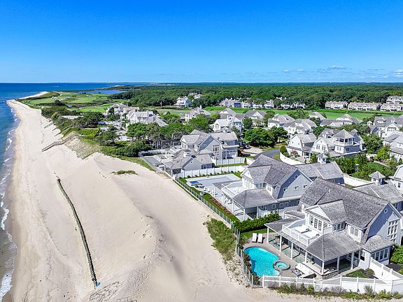 Set on a picture-perfect sandy beach overlooking Nantucket Sound, this meticulously designed home offers resort living at its finest. The six-bedroom residence is set within the exclusive Seaside community at New Seabury and showcases unsurpassed attention to detail throughout with sweeping ocean views from nearly every room. The open concept floor plan caters to relaxing and entertaining with a well-appointed living room that features beamed ceilings, custom built-ins, a wet bar, and fireplace. Glass doors that seamlessly blend indoor and outdoor living open to the breathtaking terrace with a gunite pool, spa, outdoor kitchen, and panoramic views. The chef's kitchen is sure to please even the most discerning, equipped with Wolf and Sub-Zero appliances, a spacious island, and breakfast bar. A first-floor primary suite, currently configured as a home office, provides comfort and convenience, while a second primary suite on the upper level enjoys a large private balcony, a walk-in closet, and a sumptuous bathroom. Three additional bedrooms, two of which are en suite, complete the second floor. A finished lower level provides flexible living space with a media room, gym, bedroom, and a full bathroom. Located minutes from championship golf, tennis, fine dining, a marina, and everything else New Seabury has to offer, this exquisite residence delivers the perfect Cape Cod lifestyle.