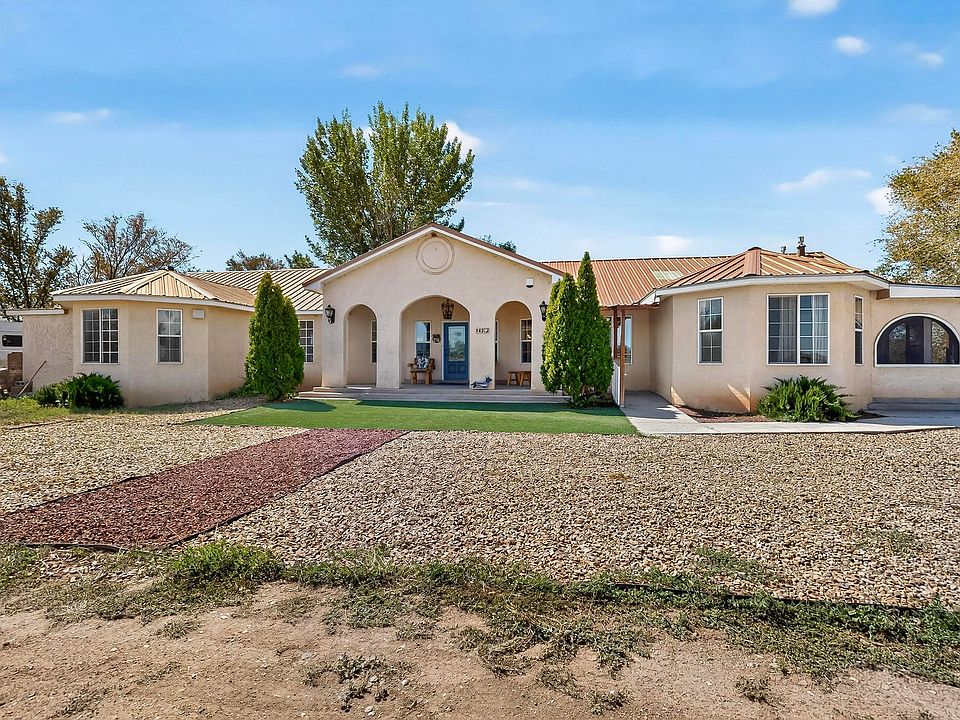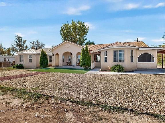 This charming country home offers endless possibilities! The spacious kitchen features beautiful custom cabinets installed in 2021. Durable laminate wood floors run throughout the home, also added in 2021, complemented by designer lighting in select spaces. The primary suite includes a roll-in shower and a walk-in bathtub for comfort and accessibility. Flexible layout allows for two living rooms, a home office, or even an additional bedroom. The attached casita provides 2 bedrooms, 1 bath, its own private entrance, and potential handicap accessibility (buyer to verify). If desired, the casita can easily open to the main home, creating a 4-5 bedroom setup. Outside, the property sits on 2 acres with ditch rights, a chicken coop, and two detached garages ideal for storage,toys,or a workshop.