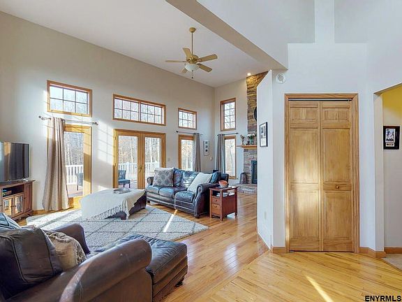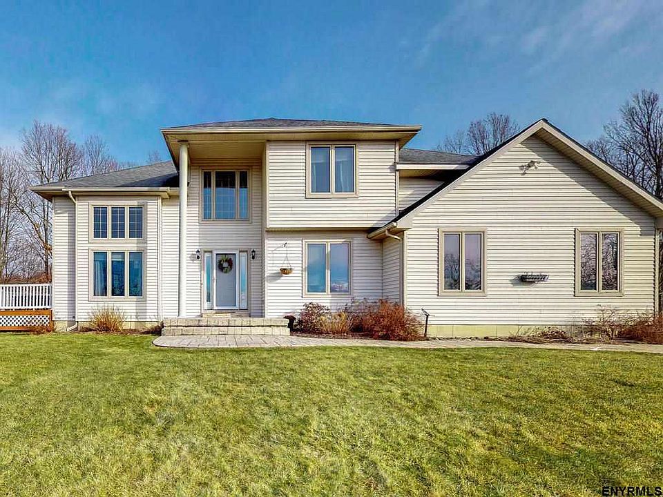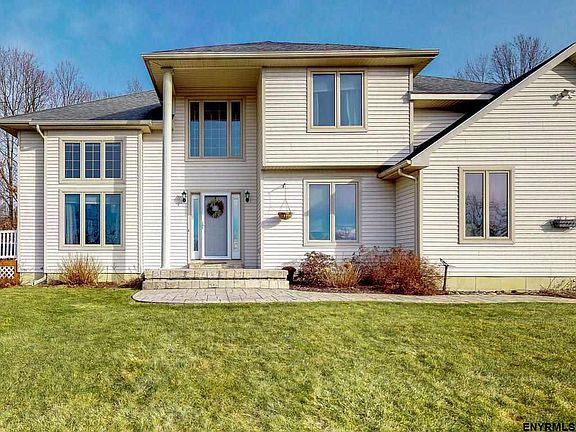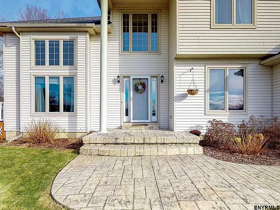 Be one with the outdoors! Spacious & bright custom built featuring amazing views from this private 5.8 acre lot. Great Rm w/Gas FP & stone hearth, gleaming hardwood floors/opens to Living & kitchen areas. Floor to ceiling windows to enjoy the natural surroundings. Lower level FamRm w/projection tv & surround sound. More space to finish. Master br suite, mature & newly planted fruit & perennial bushes. Large deck, patio w/firepit & covered eating bar. Short commute to malta, Saratoga & Albany.