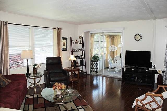 Listed by the OFFICIAL SALES OFFICE of this Community. Nice well-kept home being sold turn-key and ready for you to enjoy. Beautiful wood look laminate flooring in the living, dining, hallway and guest bedrooms. Remodeled kitchen with new white cabinets, countertops, appliances and luxury vinyl tile flooring. Large living room with access to the lanai and adjacent to the formal dining room with built-in display cabinet. Spacious master bedroom with his and her closets and bathroom with dual sinks. Relax in the raised lanai with vinyl windows or the side screened lanai under the carport. Convenient storm shutters. Nice landscaping on a large corner lot. Great location, just around the corner of the community amenities including; swimming pool/hot tub, fitness center, library, billiard room and more. Turn key furnished. This home is in a very active, 55+ community with many clubs, sports and activities for the residents. Amenities include two swimming pools, three clubhouses, hot tub, sauna, state-of-the-art fitness center, library, billiard room, shuffle board, tennis courts and pickle ball courts. HOA fee includes: site lease, water/sewer, trash/recycle, lawn mowing, basic cable, 24 hour attended gatehouse and access to all community amenities.