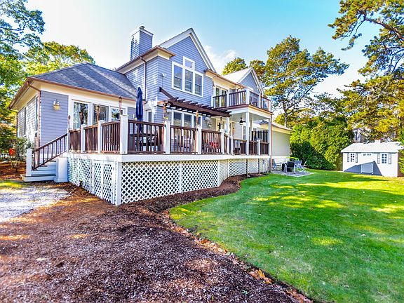 Waterviews at New Seabury! Discover this beautiful 3 bedroom, 3.5 bath custom-built Cape with direct access to Fells Pond, perfect for swimming, kayaking and enjoying the serene natural setting. This thoughtfully designed home offers an inviting open floor plan perfect for modern living and entertaining. Beautiful kitchen with center island, stone countertops, and stainless steel appliances opens to the spacious living room with a gas fireplace and dining area. Primary ensuite with walk-in closet, luxurious bath featuring a double vanity, tiled shower stall and slider to the deck. Home office, laundry and half bath complete the first floor. Upstairs you will find two additional ensuite bedrooms for guests or family, loft area with access to a deck overlooking the yard offering scenic pond views. Expansive deck ideal for entertaining, shed for extra storage, 2 car garage, gas heat & central air. All parties to verify information contained herein.