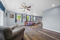 Enormous family roomDining roomNatural lightCorner lotFenced backyardCozy gas fireplaceBay window