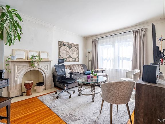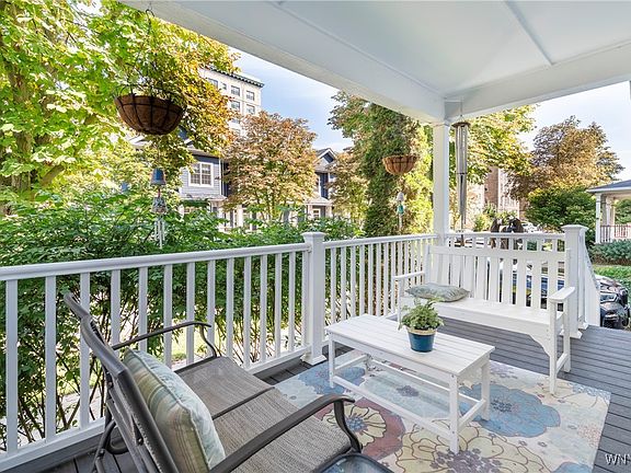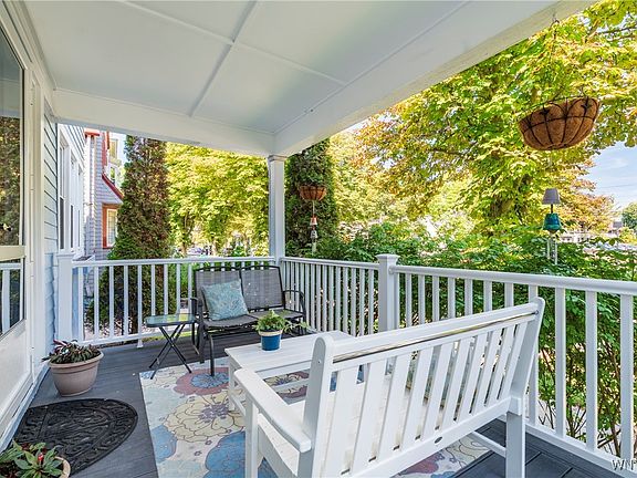 This exceptional 4-bedrm, 2.5-bath home offers over 2,000 sqft of beautifully finished living space across 3 floors. The 1st floor features newly remodeled custom kitchen w granite countertops, functional island, ceiling-height cabinets, built-in microwave drawer, & durable Blanco Silgranit composite sink. A bright & inviting formal dining rm is perfect for entertaining, while the spacious living rm highlights the original marble fireplace, built-in shelving, & gleaming hardwood floors. Upstairs, the 2nd floor offers 3 generously sized bedrms and 2 full baths. The fully finished 3rd floor adds remarkable versatility w 3 additional rms, including 4th bedrm & soundproof music room. Recent updates include new hot water tank (2024), 4-camera security system, & Generac generator. Outdoors, enjoy a quiet, partially fenced yard w stamped concrete patio, plus rare two-car garage w storage above. Present owner has a mid sized car and has no issues getting in and out of driveway! The new Trex-covered front porch adds even more curb appeal. Located just steps from the vibrant shopping & dining of Elmwood Village, this home is truly a must-see gem in a prime location!