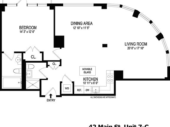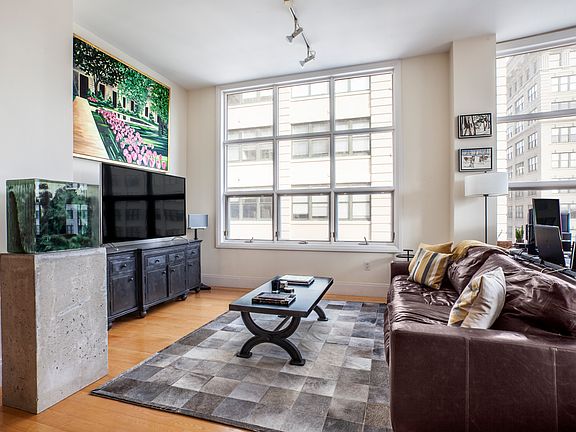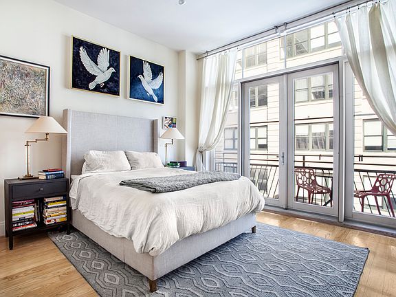Introducing an architecturally unique and sunny one bedroom/two bath (convertible two bedrooms) apartment in the heart of Dumbo, steps from the waterfront. High ceilings and a dramatic curved wall of windows make this home bright and beautiful. Light floods in from the eastern and southern exposures. There are river views form a Juliet balcony off the master bedroom. Enjoy an open kitchen with Wolf stove, two marble baths, a laundry room with vented W/D, and hardwood floors throughout.