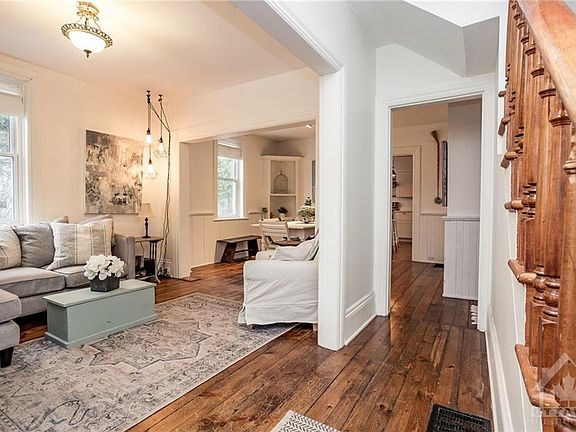 This charming home in Almonte has many unique features and is set in a tranquil location. As you enter you will notice the hardwood floors flow through the open concept living and dining room. The bright and airy kitchen space is great for preparing meals and entertaining. The back room on the main floor is a flex space that can be used as a bedroom or office. You can access the back deck and yard off of the large mudroom. Two bedrooms, a full bathroom and a loft space are located on the second level. One of the most unique and exquisite features of this home is the yard. 232ft deep with beautiful mature trees and gardens. The new summer house sits on the top of the property with a stunning oversized glass front overlooking the Mississippi River. A second outbuilding with electricity and heat could be a studio or workshop. The opportunities are endless! Relax on your front porch and enjoy views of the water and feel at home in this quiet street in the beautiful town of Almonte.