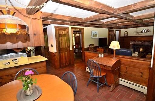 Set back from the road amidst a beautiful, private setting is this Colonial Reproduction filled with country ambiance. Stone walls, sprawling lawn and woodlands surround this eight room Colonial featuring exposed beams, wide pine flooring throughout, two brick fireplaces and lots of character! Recent upgrades include: furnace and water heater, stainless steel appliances, paved driveway, brick walks with granite steps, and electric service for a whole house generator. Enjoy summer evenings on a large screened porch overlooking a very private yard. Enjoy winter evenings fireside by handsome brick hearths. A Leyden Hearth fireplace insert is capable of heating the entire house. Picture perfect New England setting and home!