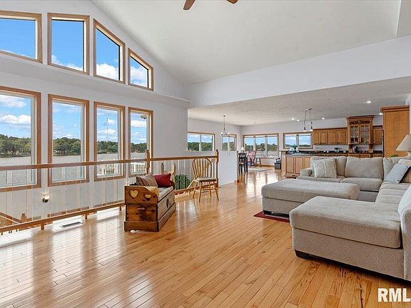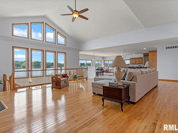 A rare opportunity to own one of the most extraordinary Lake Springfield properties presents itself. Sitting on over an acre, and offering unparalleled views from virtually everywhere, both inside and out. The second you step inside your eyes are immediately drawn to the stunning 2 story wall of windows that provide breathtaking lake views, and immense natural light. Gorgeous hard wood flooring spans the open floor plan of the main level. Amazing living room with gas fireplace, plus formal dining and picturesque breakfast nook. The primary suite is a showstopper, complete with a massive walk-in closet that has to be seen to be believed. Cooks of all kinds will love the size and beauty of this kitchen, with a double wall oven, island w/gas range, counter and cabinet space galore, and a walk-in pantry. The basement delivers unlimited possibilities. With a family room for relaxing, 2 additional bedrooms, a perfect home office for getting work done in peace, and an expansive 51 x 20 rec area with a wet bar for entertaining as many guests as you need. That's just inside! The exterior checks every box with a truly impressive wraparound deck on the main level, and the walkout basement leading to a partially covered concrete patio that seemingly never ends. There's an attached 2 car garage, a detached 2 car garage that could house a boat, and a dock with a new heavy duty lift. Geothermal keeps utilities low. Sump w/water backup. Two H2O heaters. Did I mention the views?