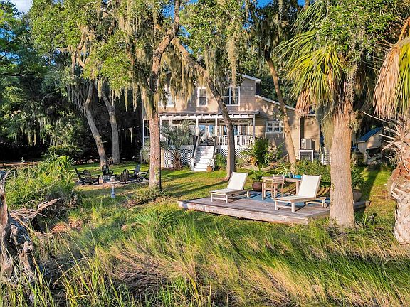 This charming waterfront home offers stunning tidal creek views of Brickyard Creek, with breathtaking sunsets as your daily backdrop. The main level features an open layout adorned with beautiful pine floors throughout and a cozy wood burning fireplace. The kitchen boasts custom cabinetry, sleek quartz countertops, and a seamless flow for entertaining. Also on this level is a bedroom with an ensuite bathroom, while a second room is perfect for a home office. Adjacent to the office is a cozy screened-in porch, ideal for relaxation.