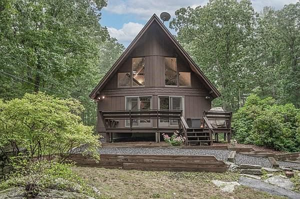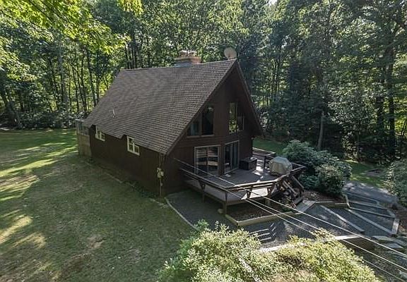 Welcome home to this charming A-Frame Contemporary home set on a 1.75 acre lot with soaring cathedral beamed ceilings! The 1st floor offers an open floor plan w/ two sliders to front deck great for outdoor entertaining, beautiful floor to ceiling masonry fireplace w/wood stove insert keeps the house toasty warm in those winter months, living room, dining room, kitchen with oak cabinetry w/cathedral ceiling, mudroom & pantry storage, spacious 1st flr main bedroom w/ slider to private back deck w/double closets, 2nd bedroom w/closet, & updated full bathroom w/tub. The 2nd floor offers a 3rd bedroom, loft area to use as an office or sitting area, 2nd full bathroom & closet storage. Lower level offers a 2nd wood burning fireplace, family room, bar area, walk-out to patio, laundry area with work area, 1 car garage under with additional storage. Newer oversized shed plus a woodshed, raised beds for gardening, level yard for lots of outdoor fun! A must see!!