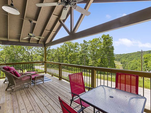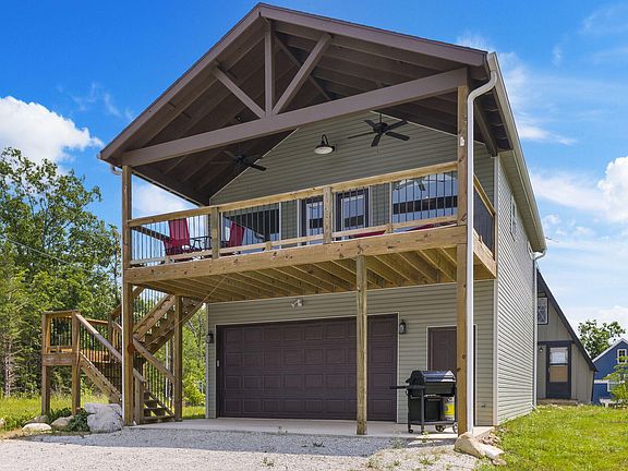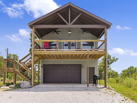 Enjoy the lake all day and then star gaze on the large covered porch at night from this beautiful vacation/permanent home in Swiss Villa Subdivision that was built in 2020. This growing community in Lampe is a fabulous place to spend your weekends and vacations with your family and friends. This home is located within 5 minutes from the Black Oak Amphitheater. This community is desired for its small-town atmosphere and periodic neighborhood events. Just down the road is a community boat launch with easy access. This home features a large deck to relax and enjoy the views. The living room and kitchen are open concept with tall ceilings and multiple windows. It is spacious and open for any type of occasion. This custom home includes two bedrooms and two full bathrooms on the main level and a half bath on the lower level. The lower level also includes a laundry area with washer/dryer connections and an oversized two car garage with an outside carport. Included are both bedroom beds, the ottoman in the living room that opens into a twin bed, two green chairs & leather sofa in the living room, pot rack, lamps, deer head mounts, gas grill, cooking grate for fire pit and the ping pong table. This home is practically move-in ready. Don't miss out on the opportunity to own this gorgeous lake retreat!