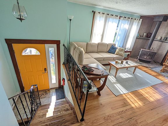 Upstairs are two large bedrooms (California King and Queen beds) and a full, newly renovated bathroom. Downstairs is a large open room (two Twin beds), and another full bath. Newly refinished hardwood floors throughout. Fully stocked kitchen. The big back deck off the kitchen is perfect for morning coffee and meals. Downstairs is a laundry room with a washer and dryer. Off street parking with two driveways.