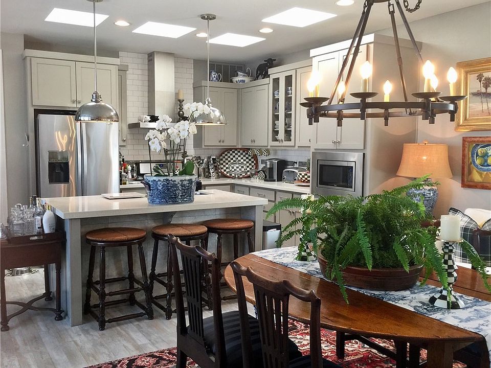 Spiral staircaseChrome pendant lightsLarge picture windowsStainless farm sinkGrey custom cabinetsSubway and glass tileQuartz counters