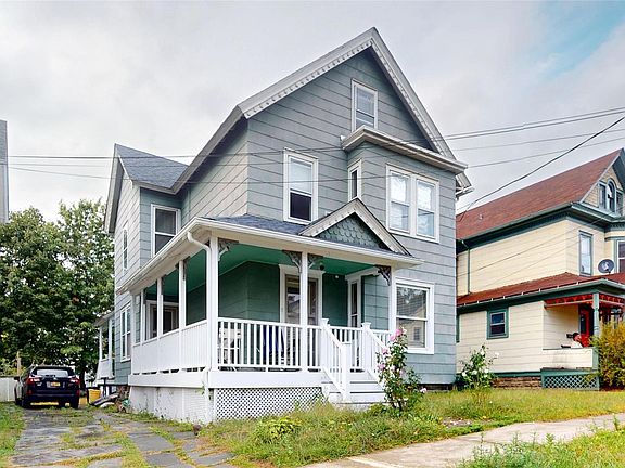 STATELY 4 BR COLONIAL w/ WRAPAROUND COUNTRY-COVERED FRONT PORCH ON FULL DAYLIGHT WALKOUT BASEMENT ON FENCED-IN 4,200 SQFT LOT IN PORT JERVIS, NY Welcome to this beautifully updated Port Jervis home that perfectly blends modern comfort with timeless charm. Ideally located in the heart of downtown, you’ll enjoy being just a short stroll to shops, restaurants, breweries, antique stores, grocery options, and the Metro North Train Station—making this a commuter’s dream with all the conveniences of city living right at your doorstep. Step inside and you’ll be greeted by a warm and inviting layout featuring soaring high ceilings and expansive floor-to-ceiling windows that flood the home with natural light. The main level showcases a large and comfortable living room, a spacious dining room perfect for gatherings, and a stunning open eat-in kitchen. The kitchen is a true highlight, boasting sleek cabinetry with abundant storage, granite countertops, stylish fixtures, and modern white appliances—all designed for both function and beauty. Sprawling luxury wood-look laminate flooring runs throughout, creating a seamless and elegant flow. Upstairs, you’ll find four generously sized bedrooms, offering plenty of room for rest and relaxation. The second floor also features a large, updated full bathroom with his-and-her sinks. Adding to the home’s unique character, two separate staircases lead to the second floor, providing both charm and convenience. The lower level offers even more versatility with a full-sized walkout basement. Here you’ll find a half bathroom, a large utility room, and an abundance of storage space—perfect for hobbies, a home gym, or future finishing potential. Additional upgrades include a newer roof, a rocking-chair-style vinyl laminate front porch, and very energy-efficient natural gas hot water radiator heat paired with a new furnace and central air for year-round comfort. Outside, enjoy off-street parking and a fully fenced yard, ideal for outdoor activities, pets, or gardening. This move-in ready home has been thoughtfully updated inside and out, offering the perfect combination of style, space, and convenience. All that’s missing is you!
