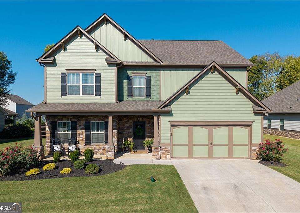 Discover this charming two-story Craftsman-style home nestled in The Reserve at Pettit Creek. The residence boasts 6 spacious bedrooms and 4 full bathrooms, offering ample space for family and guests. Relax on the inviting front porch or entertain in the professionally landscaped fenced backyard, featuring mature trees for added privacy and a covered back patio perfect for outdoor gatherings. Inside, the home features a versatile office or formal living room, a cozy family room with a stunning stone fireplace, and a separate dining room ideal for meals with family and friends. The open-concept kitchen is a chef's dream, equipped with a large island, built-in desk, white cabinets, stainless steel appliances, granite countertops, and pantry. The main level includes a convenient bedroom and a full bath, perfect for guests or related living. The upper level is dedicated to the primary suite, complete with a private bath featuring a walk-in shower, soaking tub, and a spacious walk-in closet. The primary bedroom has been enhanced with a stylish wood accent wall and barn door, creating a warm and modern retreat. There are four additional bedrooms, two full baths, and a laundry room with cabinets on this level for added convenience. The home also features updated exterior paint, new carpet throughout, and a mudroom with cabinetry for organizational ease. Enjoy the community amenities, including a sparkling pool, tennis courts, playground, and pond-perfect for outdoor recreation and relaxation.