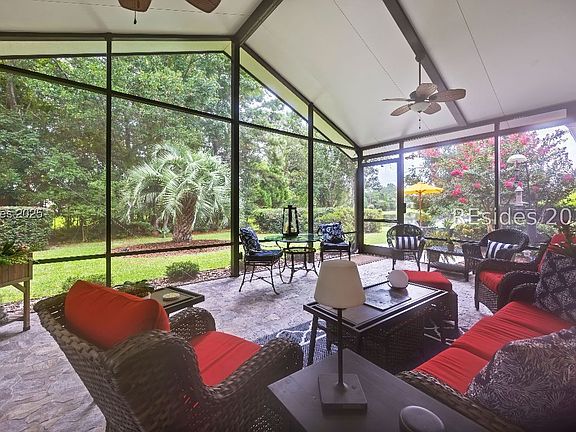 Desirable Wisteria Model, 3BDR, 2.5 baths, plus library/den with bookshelves, 3rd BDR is a custom designed office with built-ins that can stay or be removed to be a bedroom again. Dining Room and Living Room with gas FP and custom built-ins and a Sunroom. Large eat-in Kitchen with Island and Breakfast Bar, Granite Counters, Tile Backsplash, SS appliances, pantry. Beautiful Screened in Lanai 26 x 16' built in 2022 with tile floors and added concrete patio for bird watching and ceiling fans for relaxing while you are grilling. Watch the sunrise from the bay windows in the Kitchen or Primary Bedroom and enjoy the sunset every evening out back in the Lanai or on the Patio! Expanded/Extended Garage has washer & dryer, and the laundry room is now the craft/flex room. Roof replaced in 2020.