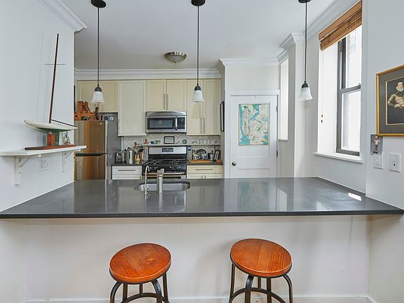 Classic 2BR/2BA apartment directly across from Marcus Garvey Park! Combine the old world charm of crown moldings and solid oak floors with modern updates such as a marble open kitchen, GE Profile stainless appliances and in unit washer/dryer. The primary bedroom has ensuite bath. Both baths come with Kohler fixtures, deep soaking tub and soothing marble walls. The rear bedroom has views of the courtyard below. There are ample closets in each bedroom