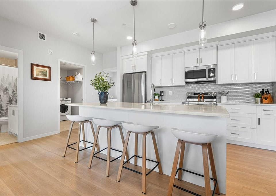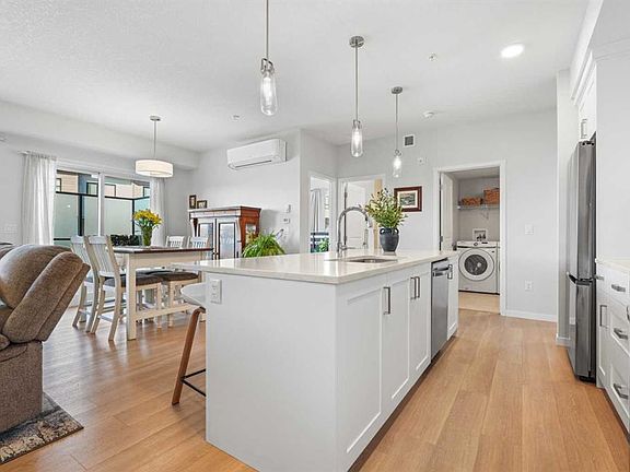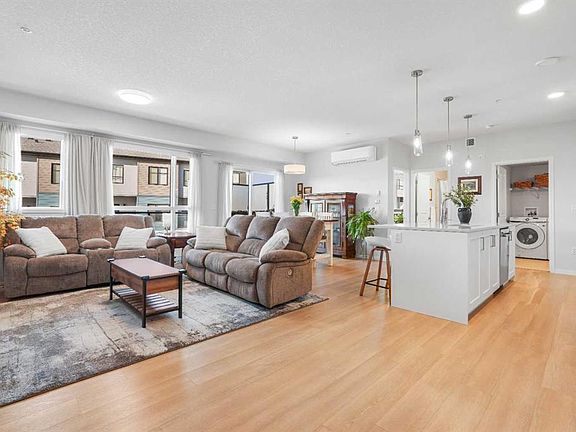 OPEN HOUSE-SATURDAY NOVEMBER 22ND 1-3 PM - Discover refined living at this bright and beautifully maintained NW corner unit in Riverstone Manor offering over 1,040 sq. ft. of thoughtfully designed living space, with an exceptional layout and an ultra-private position in the building. Featuring 2 spacious bedrooms, 2 full bathrooms, and a full-sized laundry room, this home offers both functionality and flow in one of Cranston’s most desirable communities. The welcoming foyer opens into a generous open-concept great room, filled with natural light from walls of windows. The living and dining areas offer flexibility for hosting, relaxing, or working from home. The kitchen connects seamlessly to the main living space and includes full-height cabinetry, quartz countertops, a large island with seating, and modern stainless steel appliances. Double patio doors lead to a rare 20’ x 7’ West facing balcony, offering the perfect outdoor extension of your living space, with no direct neighbors beside you, this is one of the most private balconies in the complex. Whether you’re sipping your morning coffee or enjoying golden hour sunsets, this space offers peace and open sky every day. Inside, luxury vinyl plank flooring runs throughout, with no carpet in sight. The primary suite includes a walk through closet and a 4-piece ensuite with dual sinks and a walk-in shower. The second bedroom, positioned on the opposite side of the unit for privacy, offers flexible use as a guest space, office, or den, and is adjacent to a full 4-piece bathroom. The spacious laundry room provides additional storage and everyday convenience. Additional features include 9’ ceilings, ductless A/C, and heated titled underground parking. With Alberta New Home Warranty still in place, you can purchase with peace of mind. Located steps from the Bow River, Fish Creek Park, and extensive pathway networks, and just minutes from Seton’s shops, South Health Campus, and dining, this is maintenance free living in one of Calgary’s most tranquil, high demand communities.