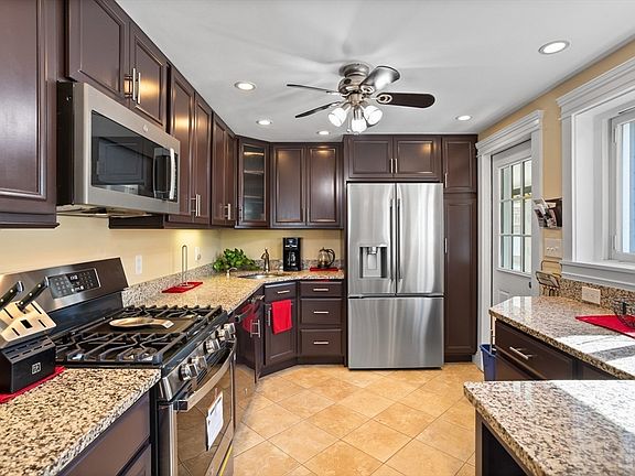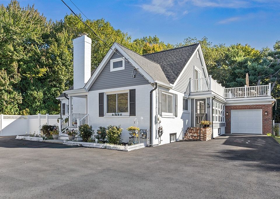 Centrally located, this 3,000 sqft. turn-key home features 2 Kitchens, 5-6 Bdrms & 3 Baths, and is perfect for an extended household! Abundant light, privacy & charm all on the Lynnfield/Saugus line, 13 miles north of Boston, moments to highways, Market St. Mall, and much more! Boasting numerous new updates: roof, siding, fresh paint, front entry, garage door, breezeway, roof-deck stairs, & stainless appliances, are just a few. Enjoy three levels of living, starting with a well-designed kitchen, both stylish & functional, featuring stone counters & a peninsula that leads into a bright dining rm. Then flow into an elegant living rm w/ gas-fireplace, oak flrs, adorned w/ crown molding, and complemented by 3 Bdrms. Upstairs, find a full bath, 2 Bdrms, cedar closet, which leads out to an extended roof deck to a resort-like equipped patio/pool area. Relish the lower level with 2nd full kitchen, an open dining-living area and wet bar, making it perfect for live-in adult children or in-law.