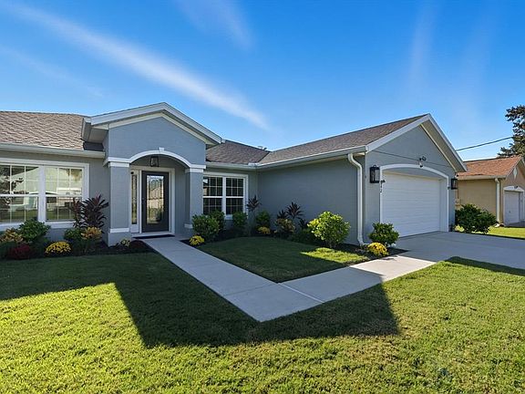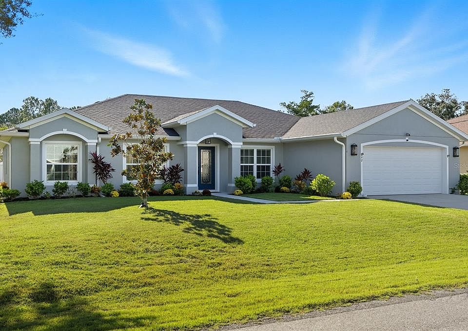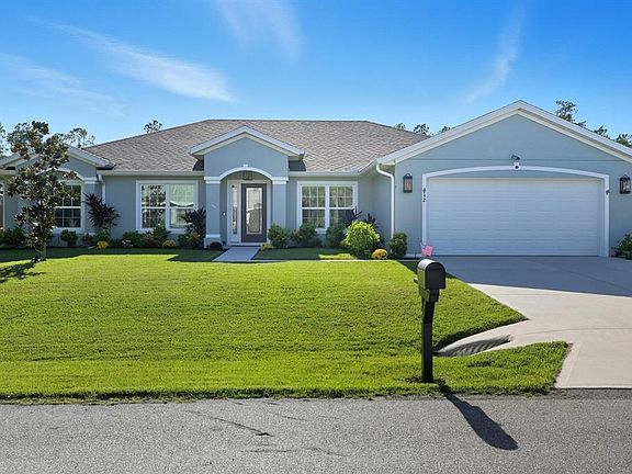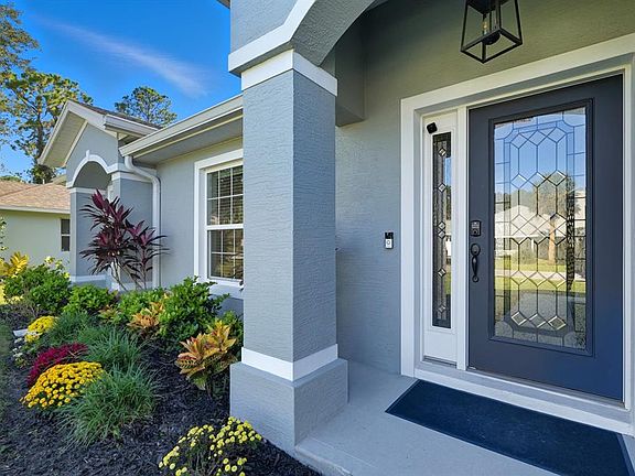 Immaculate Seagate-built Willow model located in the desirable Pine Lakes neighborhood! This move-in ready 2021 concrete block home showcases timeless design, elegant finishes and thoughtful upgrades throughout. This light-filled, open-concept layout is enhanced by vaulted ceilings and stunning ceramic faux wood tile flooring in the main living areas. The gourmet kitchen features quartz countertops, stylish backsplash, white cabinetry, and stainless steel appliances. The luxurious owner’s suite feels like a retreat with plush carpet, two spacious walk-in closets, and a spa-like primary bathroom, complete with a custom L-shaped dual-sink vanity topped in quartz. A flexible bonus room with closet provides the perfect space for a home office, den, or fitness room. Enjoy Florida living on the extended covered lanai with a 6-inch concrete slab and retractable windproof awning; ideal for relaxing or entertaining. Washer and dryer are conveniently set on pedestals in the laundry room, offering extra storage space. The large partially fenced backyard is perfect for a future pool. Additional upgrades include $5,000 in designer lighting, hurricane-rated windows, whole-house water filtration and softener, irrigation system, Blink and Ring cameras, and more. Close to parks, golf, shopping, and just minutes to Flagler Beach. Experience a home that’s far from average, crafted for those who value quality, care, and style in every detail.