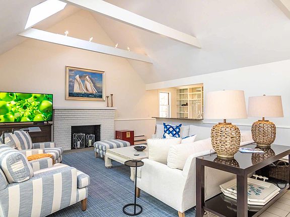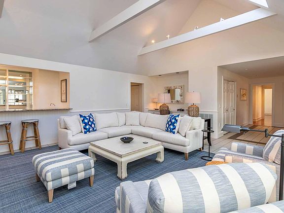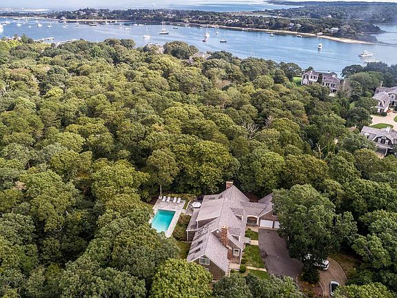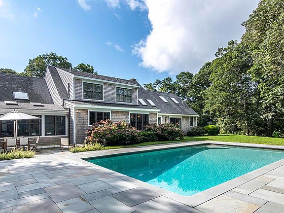CLASSIC EXPANDED CAPE WITH SALTWATER POOL & DOCK SLIP - Quietly tucked away in the desirable Witchwood area of Katama surrounded by mature woods for total privacy. Combines great outdoor space around the pool area, with newly refreshed indoor spaces. First floor features a large Family Room with ample seating, Wet bar Area with counter seating & separate built-in work space, also a wall of glass sliding doors that open into a Sunroom with seating overlooking the pool. The Family Room also opens into the Gourmet Kitchen with generous breakfast bar & built-in appliances including a wine cooler. The Formal Dining Room, Living Room and Den each provide additional lounge and entertaining spaces. Completing the First Floor are Two Bedrooms, including the Primary with en suite bath and Two Walk-in Closets. Upstairs are Three Bedrooms - one with a large Bonus/Sitting Room - Think remote learning! Outdoor living is centered around the 16 x 33 foot heated saltwater pool with large bluestone surround, plus a large patio for outdoor Dining. Association tennis courts are on the left. Private path to Prime DEEP WATER DOCK SLIP for up to a 40 foot boat! Includes FLOATING DOCK WITH RAMP!