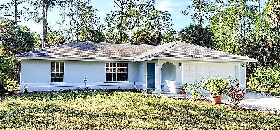 Buyer agents welcome - You'll want to see this better-than-new cozy Florida Ranch Style 3/2 CBS Home for sale by original owner with 2-car attached garage. This charming and well-maintained house is located with convenient access to main roads, shopping and great schools in Golden Gate Estates. There are no HOA restrictions in this neighborhood. It's situated on 2.73 clean & dry acres partially fenced with plenty of trees and space for the outdoor lifestyle. There are 2 outbuildings including a small stable/shed and a weatherproof shipping container. Vaulted ceilings and built-in plant shelves offer spaciousness to the open living area and split floor plan. The master bedroom adjoins a private bath and walk-in closet. Lots of updates include a 2018 NEW ROOF, 2021 Exterior Paint (Sherwin Williams Loxon XP with Super Paint), wood laminate flooring in open area, new master bedroom carpet, new master bath vanity, commode & floor tile, new guest bath vanity & floor tile, custom wood window blinds in bedrooms, extra closet shelving, super clean & freshly painted interior with newer stainless steel GE French door refrigerator, Samsung dishwasher and LG large capacity washer & dryer. The well water system and central AC/Heat have been recently updated and meticulously maintained. A new garage door opener is included as are hurricane shutters and irrigation. The lawn needs love, but the landscape beds are tidy and ready for fresh greenery. The GE glass top range and original builder grade kitchen cabinets are also vintage but still in great condition. So, you can be turn-key ready for immediate move-in with minimal updates and maintenance needed. Built strong by American Dream Homes. Its really quaint and youre going to love it! This property wont last long. Schedule a showing today! 239-272-8232 Brian & Dina Theriac
