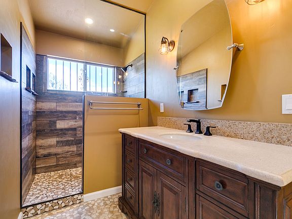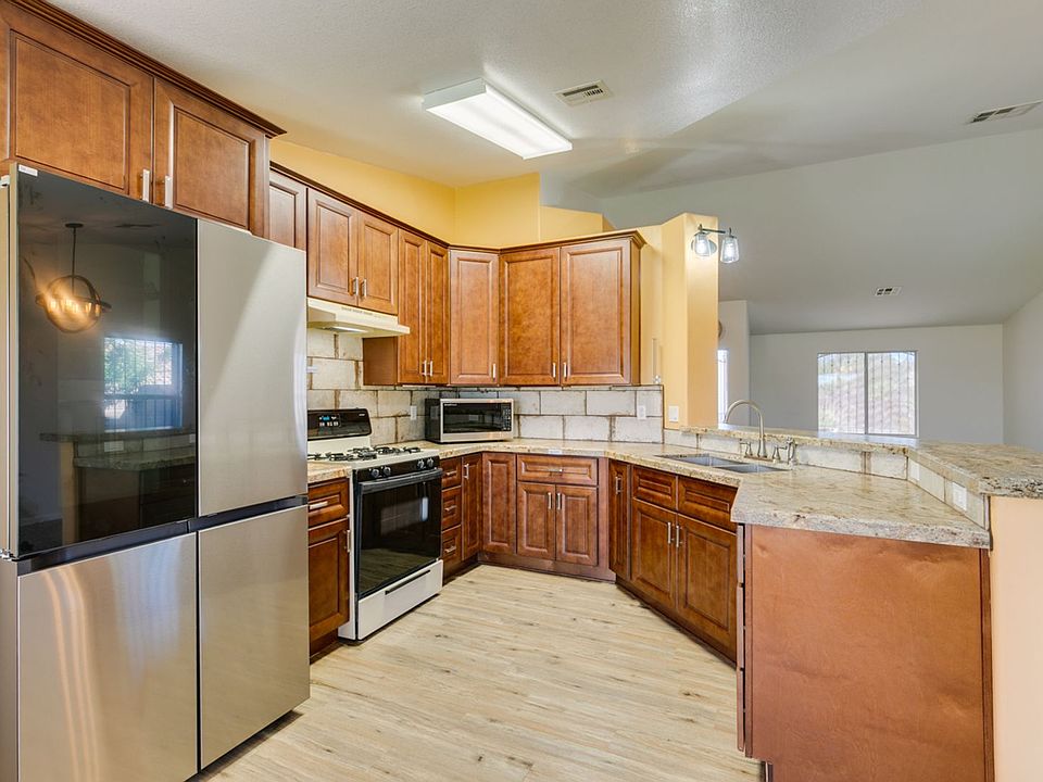 Welcome to this beautifully updated Mediterranean-style single-story home with no HOA! Inside, you'll find an open living area with a cozy fireplace, upgraded kitchen with granite countertops, and a bright breakfast nook. The spacious primary suite features a walk-in shower and deep soaking tub. Modern finishes continue throughout with upgraded bathrooms, plank flooring, and stylish trim. Outside, enjoy a private backyard with grass, a lemon tree, cactus plants, and concrete patio with pavers. Extra-wide driveway and no rear neighbors add convenience and privacy.