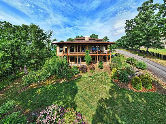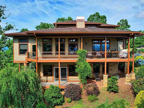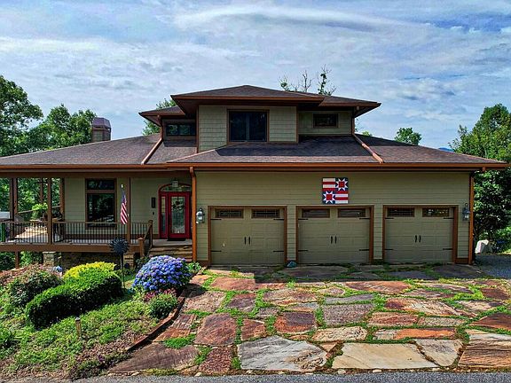 WOW! CHECK OUT THIS STUNNING CUSTOM CRAFTSMAN WITH PANORAMIC VIEWS FROM EVERY ROOM!! This is a Frank Lloyd Wright inspired design with full attention paid to all the details. This home has 3 bedrooms (one on each level) and 4.5 baths with an office and flex room. The chef's kitchen, open living room and separate dining room are perfect for entertaining with 3 fireplaces providing ambiance. The downstairs living area has a spa room complete with hot tub, a classic retro kitchen, bedroom and bath. A solar panel system and tankless water heater help to reduce high utility bills. The beautiful gardens are on the "garden parade" list for Hayesville. Existing furniture is included on a SBOS.