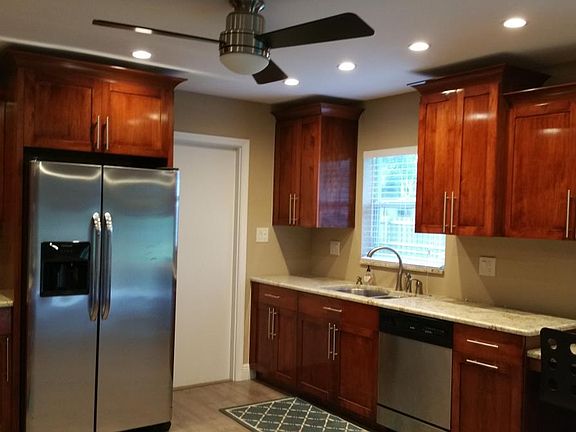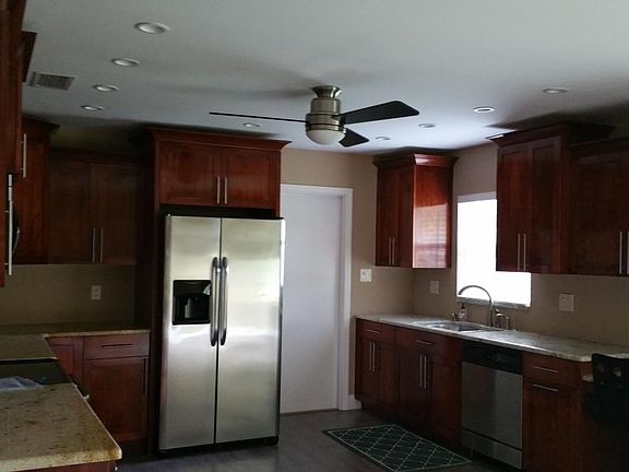 Beautifully done with new granite counters, new cherry kitchen cabinets with large handles for easy open. Cabinets close automatically. Cooktop stove, microwave, double wide stainless refrigerator, recessed lighting. Sliders to fenced in yard. All new porcelain flooring throughout. New roof and new paint. Back yard is completely fenced with vinyl. Located in a charming area of Lutz. Professional Lawn service and water softener service are included in the rent. Text only