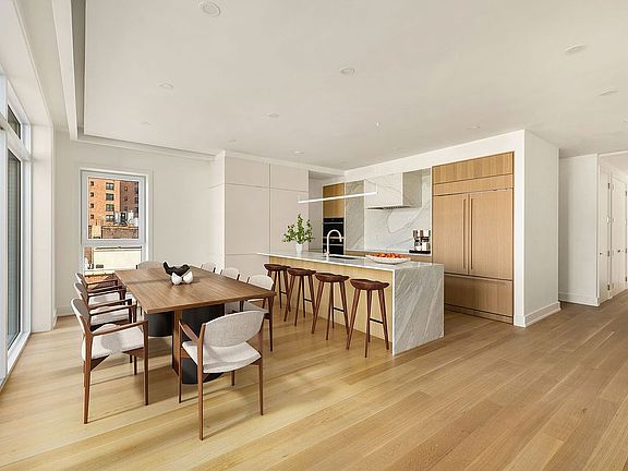 The elegant and deceptively expansive workhorse kitchen is a chef's dream equipped with a battery of professional-grade appliances by Cove, Sub-Zero, and Wolf, including a powerful externally vented hood above the cooktop. The cabinetry is clad in custom Shinnoki panels and fitted with Calacatta Caldia marble countertops. The 10-foot wide kitchen island serves as a household catch-all: a gathering hub, gossip lounge, ad hoc boardroom, games stage, and 24-7 diner. The abundant built-in storage and trash chute are a rare and indispensable convenience.