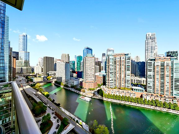Sophisticated corner residence with iconic Chicago views! Impeccably designed and exquisitely appointed, this split floor plan 2Bed/2.5Bath corner residence offers sweeping, unobstructed views of the Chicago River, skyline, Navy Pier, and Lake Michigan. Every element of this home reflects refined craftsmanship and timeless elegance, from the hardwood floors and intricate crown molding to the paneled wall details, marble baths, and custom closets with integrated storage. The chef's kitchen is a statement of style and function, featuring marble finishes, Sub-Zero and Bosch appliances, and custom cabinetry. A private balcony spans the full width of the home, providing a breathtaking vantage point of the city and river. Residents enjoy an unparalleled lifestyle with resort style amenities; including an indoor pool and hot tub, state of the art fitness center, sundeck with built-in grills and gardens, theater, party room, library, game room, children's room and resident lounge. 24 hour door staff, on-site management & engineers. Additional storage included. Garage parking available for $45,000.