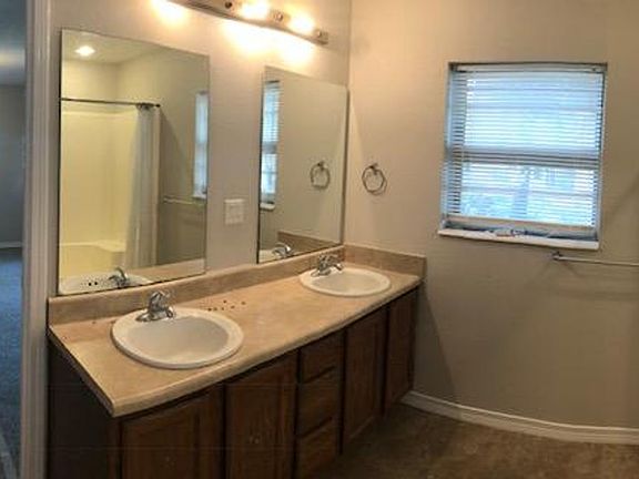 The primary suite includes a double-sink vanity and tub/shower combo; the second full bath is nicely finished with neutral tones. Bedrooms are carpeted for a cozy feel. Outside, enjoy a large front yard and off-street parking via the driveway.