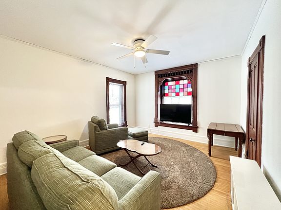 Welcome home to this beautiful 1 bedroom, 1 bathroom unit! It features a large living room with a stain glass window, a ceiling fan and beautiful wood doors. The kitchen includes a classic farmhouse styled sink with a built-in drainboard. All utilities are included in rent and it is not pet friendly.