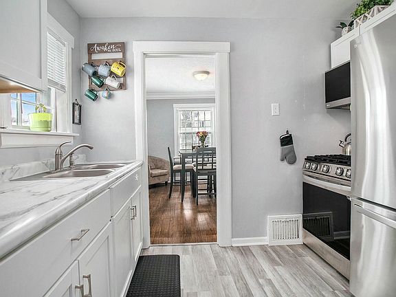 This beautiful, move-in ready home in Lakeview Schools features great updates, 1,200 sq. ft. of finished space, gorgeous hardwood floors and lovely design details of the era, including arched front door, traditional front entry room, original interior wood doors with crystal knobs and crown molding. The kitchen is updated with modern white cabinets, new counters, sink and faucet, and new appliances. The kitchen flows nicely to a formal dining room where you can enjoy family meals or entertain friends. The light-filled and spacious living room is comfortable and inviting - accented by the hardwood floors and fireplace. A staircase with curved banister leads you upstairs where there are two good-sized bedrooms with built-ins, closets and hardwood floors. A brand new tub surround was recently added to the nicely updated full bath. In the basement there is a finished room with counter and shelves, which can be used as an office or for gaming or crafts. There's also laundry and plenty of storage. Near the backdoor, there's an updated mudroom with storage and door that leads outside to the one-car garage with workbench and a large back yard with fire pit area. It's a place where you can relax and enjoy the warm summer months! PLUS - new gutters, new garage door and opener, decorator interior paint, washer and dryer included, ceiling fans, and more. Near shopping, dining, services, highways, schools, etc. This is a must-see, move-in ready home!