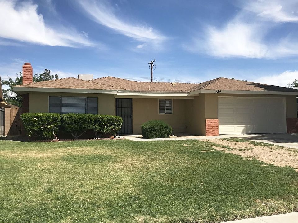 Fall in love with this charming ranch style starter home. This 4 bedroom, 2 bath home is nestled in the Northwest part of town in a quiet neighborhood. This home was remodeled at the end of 2018 and features new carpet, laminate and tile flooring throughout the home. Fresh paint inside and out, new light fixtures, ceiling fans, and doors, all throughout. Kitchen features, granite counter tops, new sink, microwave, oven/stove combo. Brand new evaporative cooling system, and garage door that can be controlled by Wi-Fi. The main sewer line from the home to the street was recently replaced and upgraded and new seeding will be put in on the front lawn in a few weeks. Beautiful front yard with automatic sprinkler system and large backyard with covered patio and plenty of space for a garden or even a pool if desired. A small area in the backyard is fenced with a gate entering into the rest of the backyard behind the house.This home is close to China Lake Naval Base, shopping, movie theater, and restaurants.