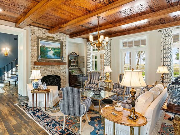 The entry hall with transom windows provides vistas of the majestic oak canopy that flank the drive into the property. The triple arched brick lined foyer transitions beautifully to the great room featuring pecky cypress beamed ceilings, fireplace, floor to ceiling windows with views over the pool terrace to the river beyond. A center island flanks the great room and entry to the kitchen featuring glass cabinetry and serving island. The kitchen, dining and sitting room welcome you to the heart of this home with a refined soft blue palette reminiscent of the finest of southern homes. The kitchen is complimented by a working kitchen perfect for entertaining. The dining area with French doors leading to the outdoor spaces is adorned in textured soft blue grass cloth and an antique chandelier. The Keeping room transforms you into a cozy space right off the kitchen.
