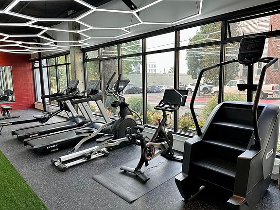 Fitness center featuring Peloton, stair master, squat rack, and more!