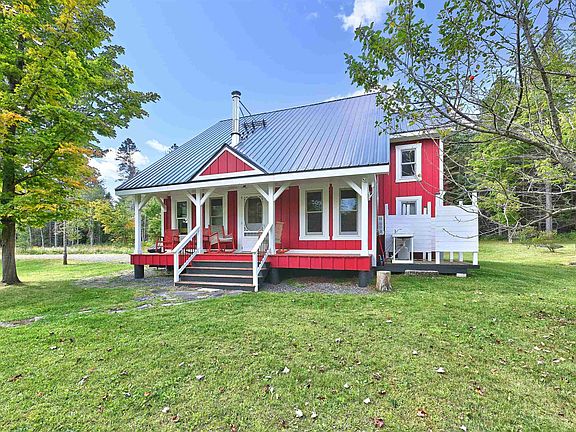 Discover your private retreat on 114 acres of Vermont woodland, just 17 minutes from Burke Mountain and under 2 miles from Caledonia County Airport, where scenic foliage flights and flight training are offered. This 2-bedroom, 2-bath post-and-beam Cape blends rustic charm with modern comfort, offering both a serene lifestyle and proven income through Airbnb. The main level features wood flooring, a sunlit great room with stone hearth, built-in bookcases, and dining area. The kitchen includes new stainless-steel appliances, gas range, and opens to a cozy living room with wood stove. A flexible office/guest room and a tiled ¾ bath with heated floors, laundry, and cold plunge tub complete the first floor. Upstairs, the primary suite offers a large walk-in closet, dual vanity, and tub/shower, while a guest bedroom has its own spacious closet. Outdoor living shines; relax on the porch overlooking the pond and footbridge, refresh in private outdoor showers, or enjoy the nearby wood-fired sauna. A firepit with benches, multiple campsites, and a dedicated RV site with hookups and deck create endless opportunities for hosting or rental income. A massive two-story garage/workshop with four bay doors accommodates equipment of almost any size. Energy independence is ensured with a solar array, Briggs & Stratton battery bank, and enclosed propane generator. With trails for year-round exploration, this property is both a tranquil homestead and an income-generating investment.