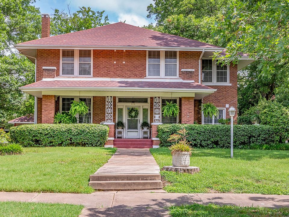 Historic Home For Sale in Bonham, TX Do you dream of taking a trip to yesteryear? Then come sit on the veranda of this Stately Historic Prairie Style Home built in 1918 and enjoy visiting with neighbors as they stroll past. Located in Bonham's Historic District only blocks from the town square and Courthouse which at present is being restored to its original 1880's grandeur. The first floor of the home has a large living room with fireplace, formal dining room with fireplace, butler pantry, sunroom, eat-in kitchen, half bath and enclosed back sun porch. The second floor has a large room/master bedroom suite with fireplace, two guest bedrooms and two full baths. Added bonus of a basement plus brick storage building. All this and only 35 mins. from McKinney, TX.