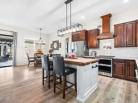 UPDATED SANTA FE-STYLE HORSE PROPERTY on over an acre with no HOA and mountain views in every direction. $200K in renovations modernized this southwest contemporary home and opened up the space to make the perfect floorplan; every inch of square footage feels intentional and meticulously planned. 2 primary suites + spacious guest rooms, 2 RV gates w/ hookups for toys, and a detached casita w/ kitchenette & full bath. Costly upgrades like the black steel-framed French doors, custom fireplace, custom-built butcher top island, and live-edge wood vanity with vessel sinks make this a forever home unlike anything else near Desert Hills.