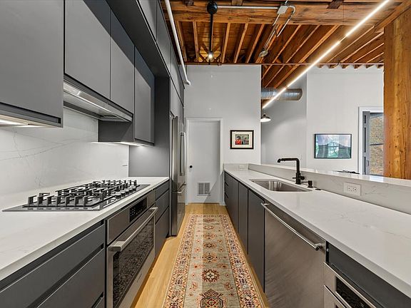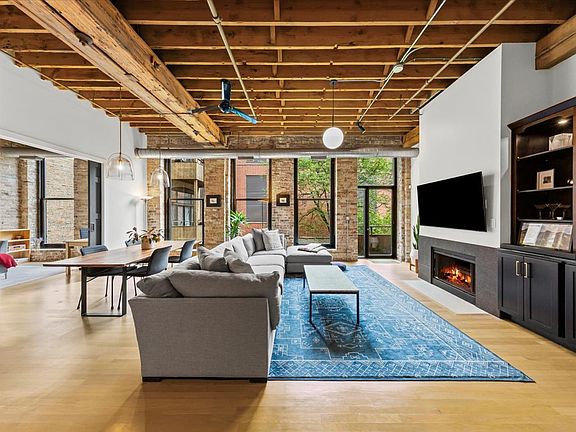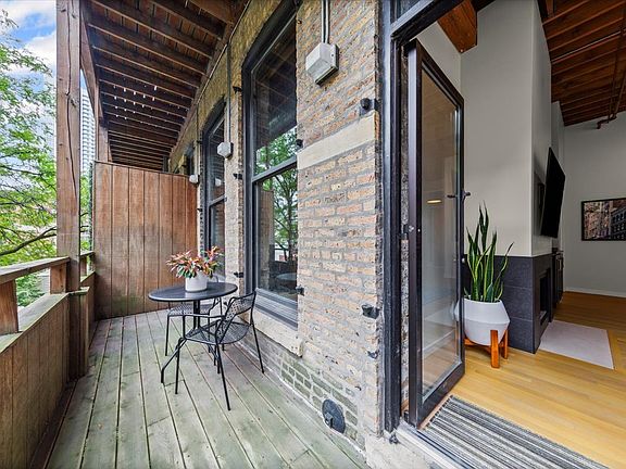 Discover this beautifully designed River North timber loft with garden views. This upgraded loft (with both bedroom walls connecting to the ceiling) features a modern kitchen with quartz counters and Bosch appliances, renovated primary bath, light oak hardwood floors, exposed brick, and soaring 14' beamed ceilings. This home includes in-unit laundry, spacious closets with ELFA shelving, and a private balcony overlooking the landscaped community garden. Unit 2E is tucked away from the street, ensuring peace and quiet with no traffic noise. Additional conveniences include indoor garage parking and extra storage. Located close to the East Bank Club, this condo offers easy access to Chicago's top dining, shopping and entertainment destinations. This is a rare opportunity to own a timber loft with outdoor space and garage parking in one of Chicago's most sought-after neighborhoods.