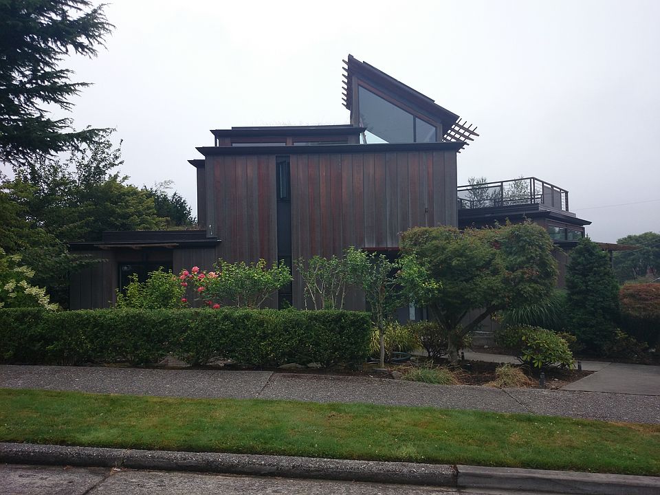 Dramatic, modern home in Magnolia with views of the ship canal, bridges, and Cascade Mountains. Resting on a south facing lot, the large windows and high ceilings create an environment bathed in natural light. A custom steel stair rail is the centerpiece of the main floor with white tigerwood floors throughout. Eco friendly features include photovoltaic panels, eco-roof, and recycled rubber decking. Multiple outdoor spaces and a master retreat with the feeling of a treehouse and expansive views.