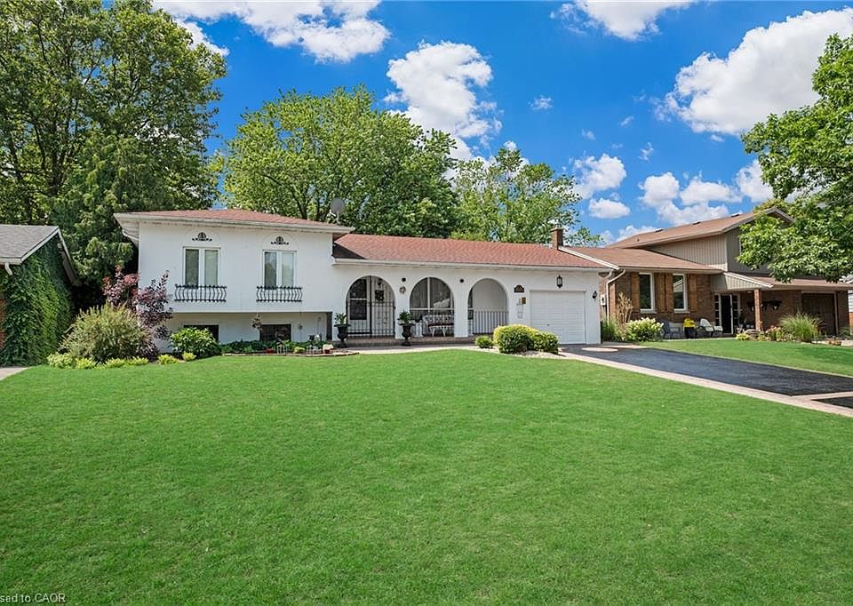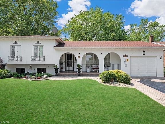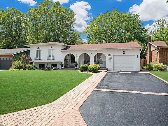 Exclusive, sought-after original Cherry Heights location in a prestigious cul-de-sac subdivision backing onto orchards with no through traffic. Ideal for families with pets, this property features a Lrg, self-contained outdoor cattery courtyard with 2 levels, 2 entrances, & a partially covered steel roof-providing safe protection for all pets and pet parents who prefer crating options. Fantastic value, as a similar home nearby recently sold well above this list price. Some interior images are virtually staged to reflect modern décor rather than the owner's traditional or antique style. This unique Hacienda-style house, circa 1973, sits on a Lrg premium 65x134 ft lot with great curb appeal, archways, custom wrought iron gates, and a 6-car driveway resurfaced 2024. Features extensive interlock brick walkways, a Lrg tandem 2 car garage ideal for a workshop. Within walking distance to town and shopping in Niagara's wine country. The southern exposure offers a spacious deck overlooking a beautiful, mature, private, fenced, pool-sized yard surrounded by cedars in a park-like setting, perfect for entertaining. A Lrg custom shed/change house with authentic Mexican roof tiles adds charm. The home has four levels with Lrg principal rms, a generous L-shaped liv/din rm, a Lrg kitchen with space for an island, and a cozy sitting area in the spacious primary bedrm. It includes 5-piece and 3-piece baths, a family rm with a wood-burning fireplace, and a bright office/3rd bedroom. There's ample closet space throughout. The walk-out basement with a private entrance allows for a nanny suite, or extra living space & includes a cold cellar vented to the garage. Recent upgrades include a new A/C unit, black & white marble-look floor tiles and kitchen countertops, exterior painting (2024), upgraded attic insulation, 30-year roof shingles (2018), and gutter guards for easy maintenance (2023). Offering privacy, character, & charm in a prime location-make this home your own!