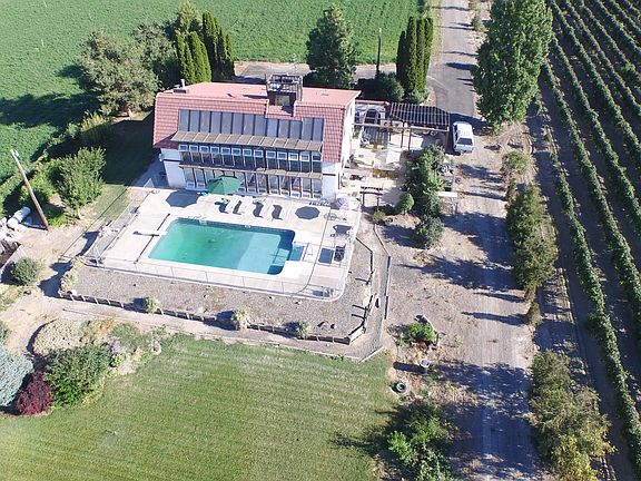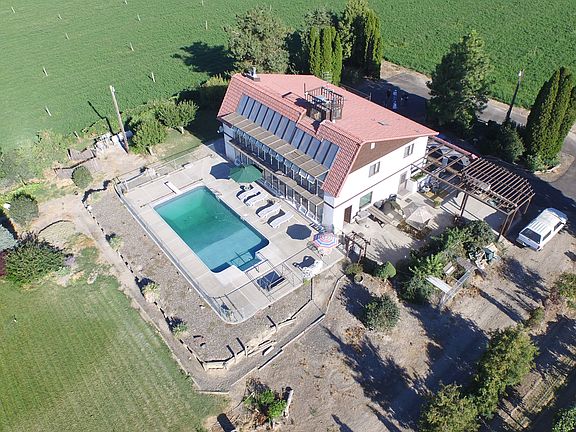This spectacular property is a one of a kind. With a view of both Mt Adams and Mt Rainier, sit by the pool and watch the sun set. Built in 1985 this home boasts one of the first passive solar systems in the valley. Includes Thermo-pane windows along with back up heat downstairs and heat pump upstairs. There are three free standing fireplaces, two wood and one propane, this all adds warmth and cozy comfort in the winter. Use the hot tub through the French doors while enjoying the same view from the rear of the house. Enter through two sets of doors into the foyer and gaze upon the winding open staircase to the grand high ceilings above. The master suite is not only oversized and includes a large bathroom and garden tub but has a fenced balcony that circles from the front to the west side of the home. Enter the living area with attached dining. A second set of French doors lead to a potting room/solarium off the kitchen. Kitchen and laundry room with new vinyl flooring and the third free standing wood stove beckons for the smell of home baked cookies. The gardens outside include fruit trees and a vegetable garden with numerous berry plants and herbs. The fenced in-ground pool is 18x36 and has a new powered cover. It has finished concrete surround for all the lounging chairs you need to throw a great pool party. The east side of the home has several pergolas for privacy and comfort, for entertaining or just a glass of wine and enjoy the cool quiet of the evening. All this with a new pump in your private well and has large three door shop in the back with covered RV parking. Make this beautiful home your own. Call for your showing today.