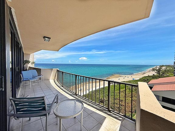 Enjoy not one, but two balconies! This corner unit features the preferred southern exposure, which maximizes the winter sun. Small nook off the kitchen leads to the additional east balcony & overlooks the unobstructed view of the turquoise Atlantic - perfect location for morning coffee or cocktails. Split bedroom floor plan and additional day bed for guests. Laundry room w/ washer dryer inside unit. Impact sliders throughout. Covered parking space. Cote D'Azur has fob access to front gate & each tower. On-site manager M-F. Pool and a large outdoor social area are between the two towers. Nicely equipped fitness center, community room, library & tennis and pickleball courts. Cote d'Azur is 15 minutes to world class shopping, dining and 20 minutes to Palm Beach International Airport.
