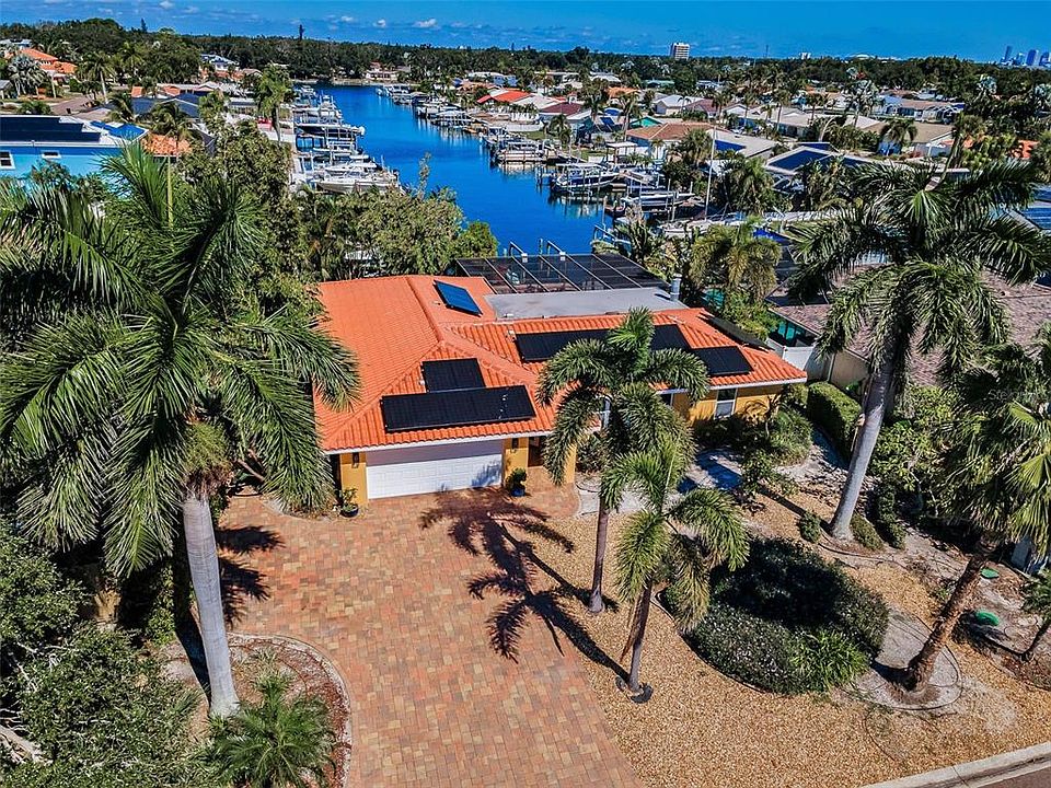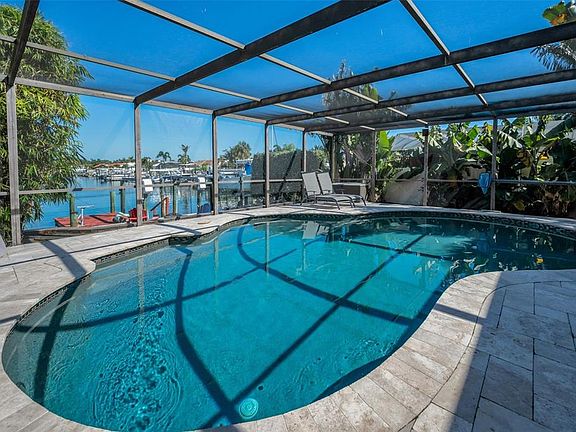 Broadwater. Extremely well maintained waterfront pool home. The base area is over 9ft above sea level protecting it from any flooding. No damage from either storm. Three bedrooms, two baths, 2,262sq.ft. of living area, and a two car garage. Open floor plan with living/dining area, family room, and a large Florida room overlooking the newly renovated pool and water. Newly installed hurricane impact sliders all the way across the back facing the water. Other features: Large private maintenance free Xeriscaped property with beautiful brick pavers in front, side, and backyard areas. Pool completely refurbished in 2020 with Travertine decking and new pebble sheen finish, new primary bedroom vanity, new A/C in 2017, new hot water heater in 2017, new electrical service panel in 2017, large inside laundry area, natural gas, reclaimed water, lush landscaping, rear fire pit patio overlooking the water and more. New owner to reap the benefits of Solar panels that were installed in 2019 slashing power bills! Excellent overall location with easy access to shopping, dining, I-275, Tampa, and Sarasota. Wonderful well kept waterfront community. Be sure to view the beautiful virtual tour.